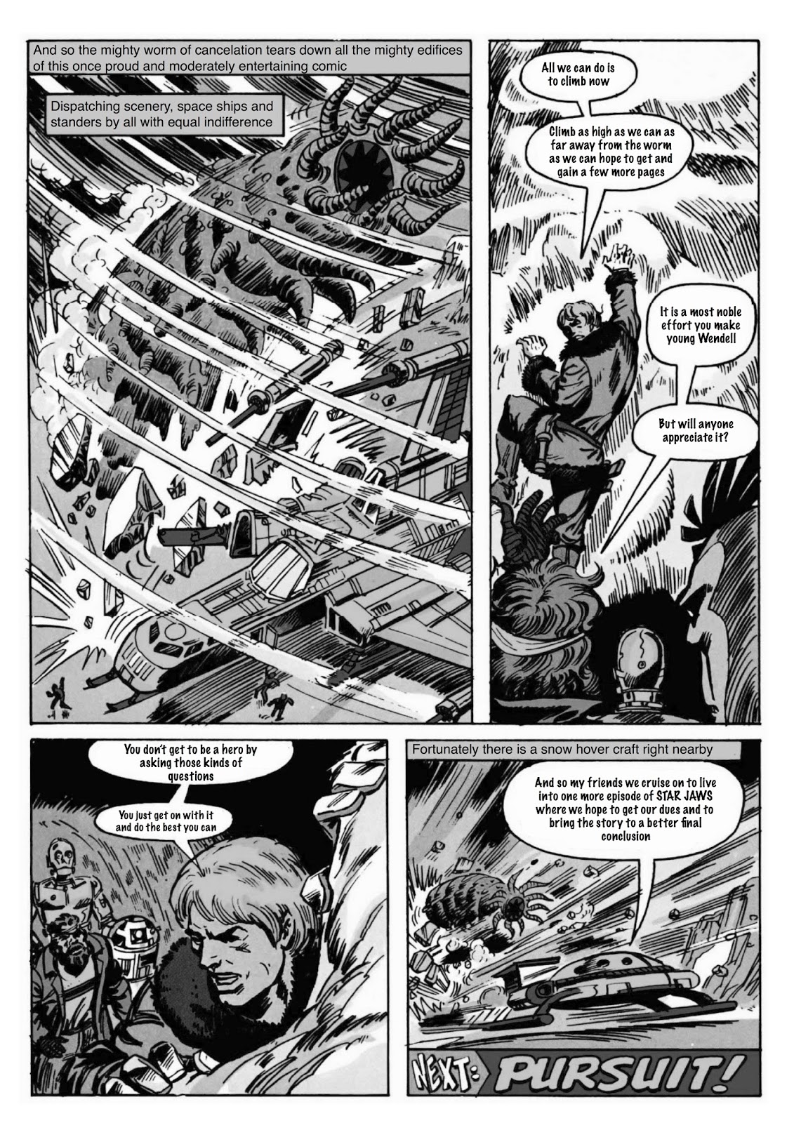 This is the thankfully the final issue of STAR JAWS. You have a great front and back cover by Martin Hand and a special story by David Robertson to look forward to, the rest of the comic is unsuitable for reading and may melt your brain! You have been warned!
